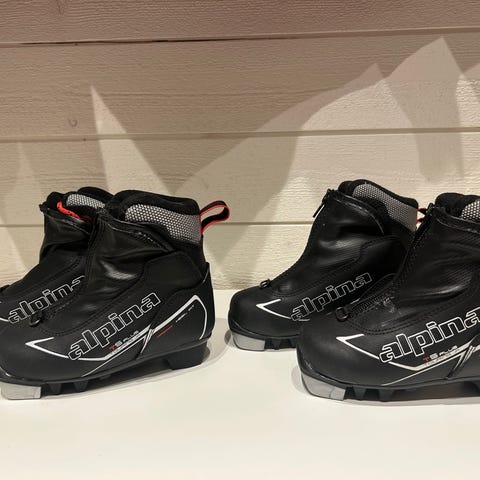 Alpina T skidpjäxor i svart färg. Skor med snörning och dragkedja framtill. Storlek 38. Endast använda ett fåtal ggr innan dom blev för små.