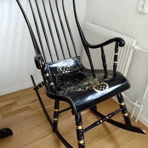 Fin gungstol i svart med gulddetaljer. 500 kr eller högstbjudande.
