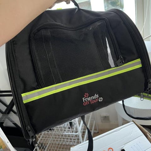i metall med en medföljande dyna. Burens konstruktion är i svart metallnät och den har handtag för bärbarhet. Dynan är mjuk och avsedd för hundens komfort.