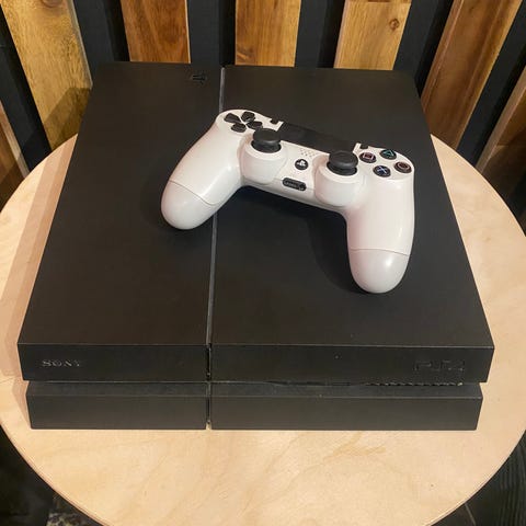 PlayStation 4 med en handkontroll och två spel