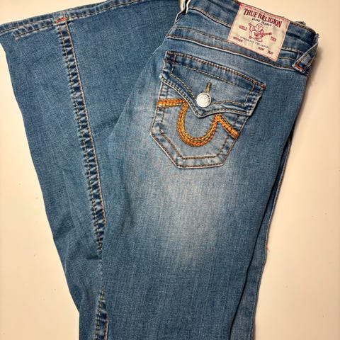 Säljer ett par ljusblå jeans från True Religion storlek 24, dom är som nya! Använd fåtal gånger då jag fått nya. Inga skador, de är bara o buda