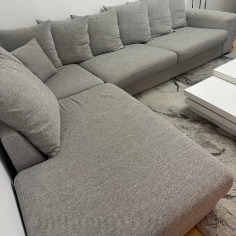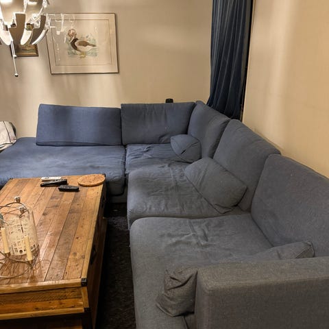Blå hörnsoffa med nackstöd och träbord