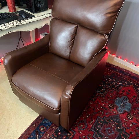 Fåtölj i oxblodsrött läder. Fåtöljen har en klassisk design med knappar i ryggstödet och dekorativa nitar längs överkanten. Stommen är i trä och ger stabilitet och stöd. Passar för användning i vardagsrum eller loungemiljöer.