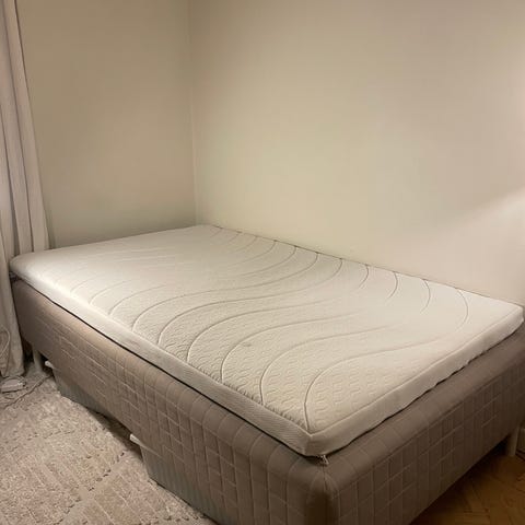 120-säng från ikea. Sängkappa ingår. Bäddmadrassen har några fläckar men går nog att tvätta bort eller annars ersätta med ny bäddmadrass. Finns att hämta i Kvarngärdet.