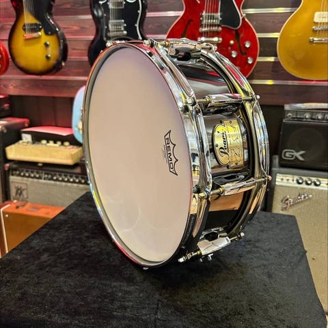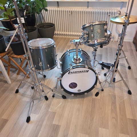 Säljer nu mitt Pearl-kit, shellpack. Gott skick, lite patina på klädseln men fortfarande riktigt snygg, grön färg. Skönt sound med björkstommar. 14-tummaren kan man sätta i baskaggen om man vill, men annars medföljer en klämma för att hänga på ett stativ.