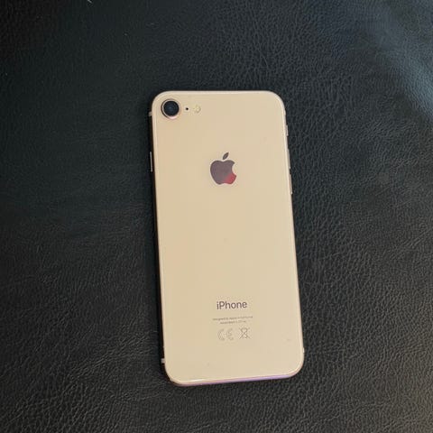 IPhone 8. Ok skick, liten skada i nedre vänster hörn och någon liten repa/spricka i skärmen men baksida nyskick