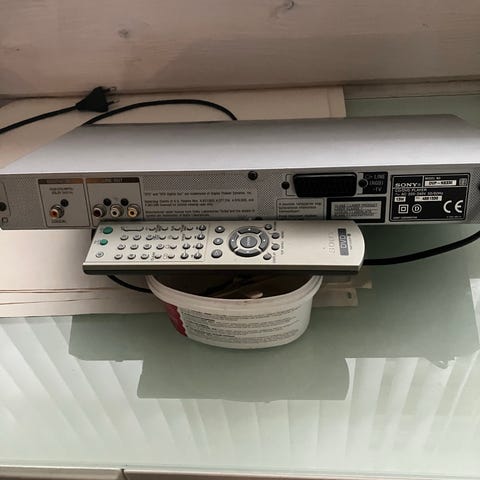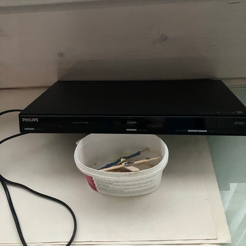 Philips DVD-spelare och DVD brännare silverfärg med anslutningskablar och strömadapter. Enheten har kontroller för uppspelning och navigering på framsidan samt flera anslutningar på baksidan för ljud och bild. Passar för uppspelning av DVD-skivor.