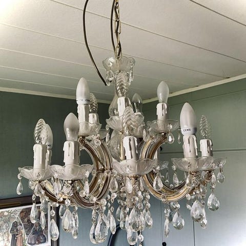 Fin Kristallkrona som är tvättad putsad med delvis ny el, kronan har ny lamphylsor och dimm glödlampor, plus byte av många ny hängen.