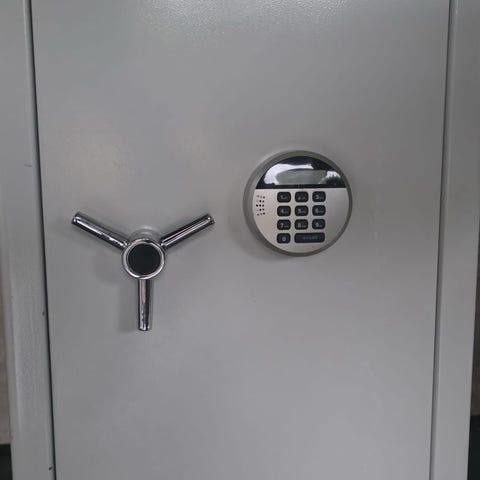 Låsbart skåp avsett för förvaring. Skåpet har en dörr med lås och är tillverkat i metall. Passar för organisering och säker förvaring av vapen eller annat