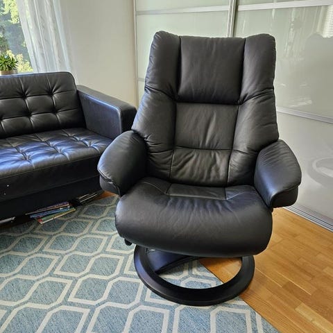 Skinnfåtöljer med justerbart ryggstöd + fotpall – mycket gott skick