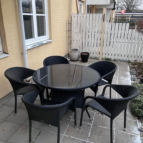 Säljer en stilren och robust utemöbelgrupp med tre svarta stolar i konstrotting och ett runt glasbord. Passar utmärkt på altan, uteplats eller balkong – året runt!