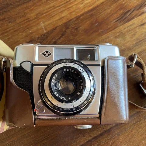 Agfa Click I kamera i brunt med medföljande läderfodral. Kameran är en äldre modell tillverkad i Tyskland, med manuell fokusering och klassisk design.