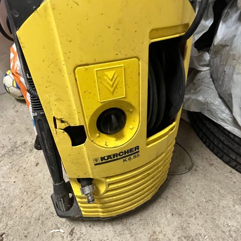 Kärcher K3 högtryckstvätt i gul och svart färg. Utrustad med handtag och slang samt andra tillbehör för rengöringsändamål. Passar för mindre rengöringsuppgifter och har kompakt design.