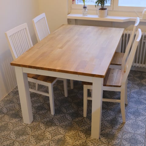 Klassiskt 180 cm matbord med vitlackat underrede och bordsskiva i oljad ek. Sex stycken klassiska Dalarös matstolar!