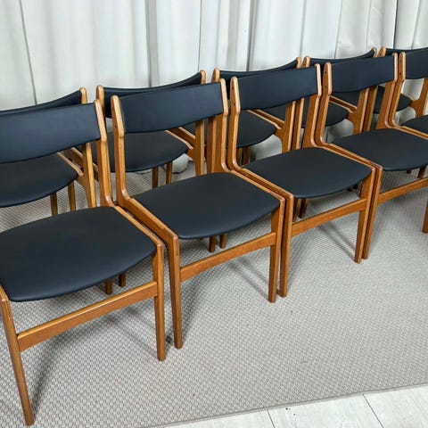 Detta är stolar i teak och svart läder/galon från Glostrup möbelfabrik i Danmark. Från 1900-talets mitt.