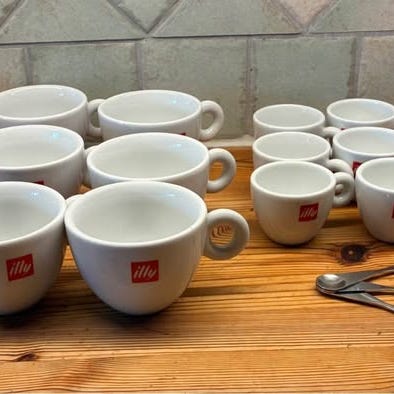 Tre kaffekoppar Me av Anna Kraitz, 120 kr per kopp. Diameter 8,5 cm höjd 6 cm. Tyvärr är faten borta. Nypris 420 kr st: https://shop.vandalorum.se/products/kaffekopp-me-inkl-fat