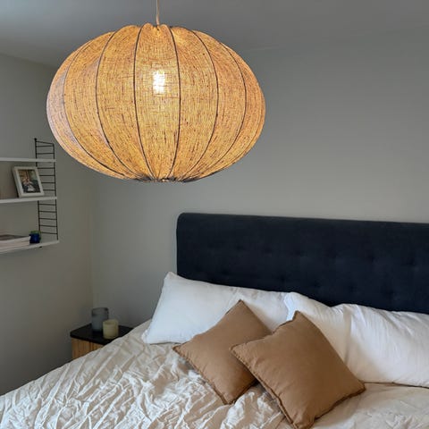 Snygg och stilren taklampa i linne från Mio. Ger ett mjukt och behagligt ljus och passar perfekt i både sovrum, vardagsrum och hall. Den naturliga linnestrukturen skapar en varm och harmonisk känsla i rummet.
