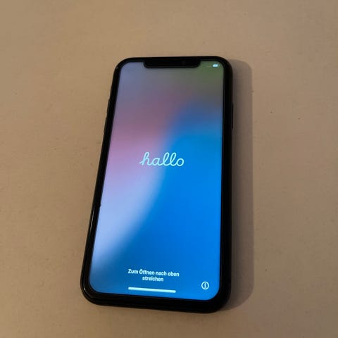 Apple iPhone 11 mobiltelefon med 64 GB lagringsutrymme i vit färg. En smartphone med dubbla kameror på baksidan och en skärm med "hello" visas vid uppstart. Levereras i originalförpackning med tillbehör såsom laddkabel och SIM-kortverktyg.