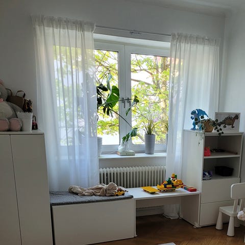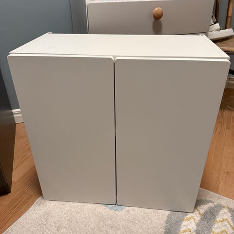 IKEA förvaringsskåp i vitt med flera skåp och lådor. Modell Stuva. Skåpen har dörrar och öppna hyllor för varierad förvaring. Liknar IKEAs modell Småstad som i motsvarande kombination kostar cirka 9 000kr.