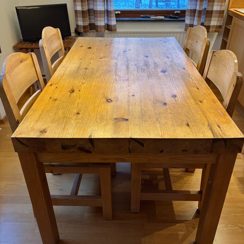 Fint och rustikt matbord med plats för 6 personer. Gammalt och välanvänt bockbord i massiv furu.