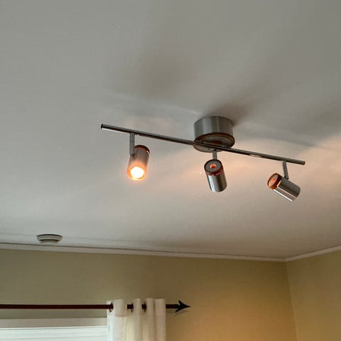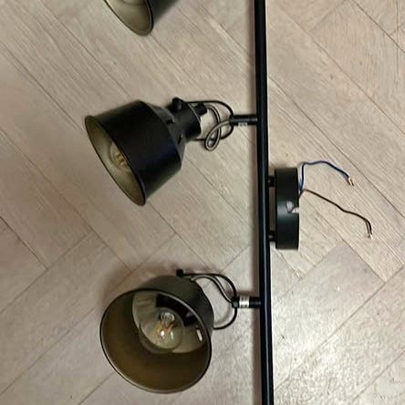 Den svarta lampan består av två cylinderformade spott som båda kan lutas 90 grader och vridas 350 grader. Spottarna är fästa på en rektangulär hållare och kan, lutade i olika riktningar, belysa olika delar av rummet.