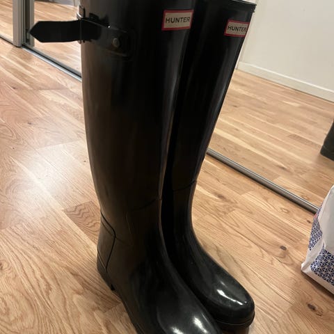 Hunter Gummistövlar i storlek 37 med svart färg. Tillverkade i gummi, lämpade för våta och leriga förhållanden. Modellen heter Original Tall, nypris ca 1.700 kr.