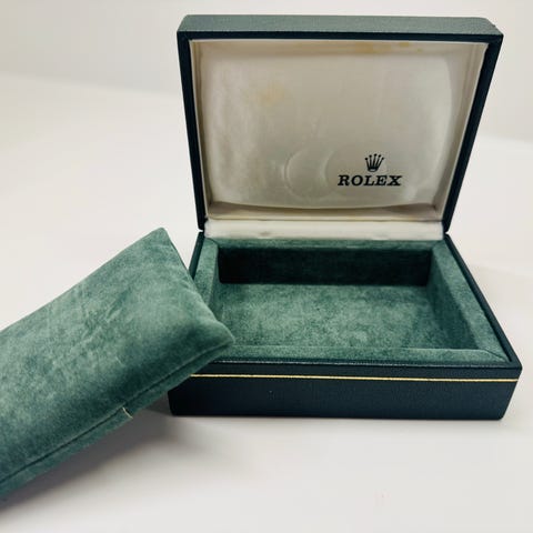 Boxen är i fint vintage-skick med korrekt grön utsida, guldpräglad krona på locket och “Creation Genève Rolex”-logotyp i innerlocket. Inredningen är ren med normal åldersrelaterad patina och ett mycket trevligt helhetsintryck för sin ålder. Orginal grön insert / klockhållare.