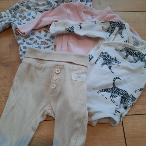 Ett set med en omlottbody och ett par byxor från Lindex. Bodyn är beige i grunden med mönstrade skogsdjur och växter. Byxorna är enfärgade med en bred mudd i midjan och har söta rävansikten på knäna. Fint skick då de knappt blivit använda.