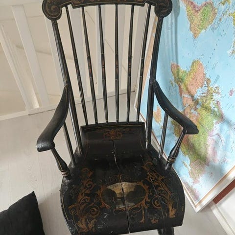En Gungstol i trä, jugendstil tidigt 1900-tal. Märkt ”Heywood brothers New York”. Höjd 100 cm, sitthöjd ca 38 cm. Bekväm. Smärre märken. Lätt bruksslitage.