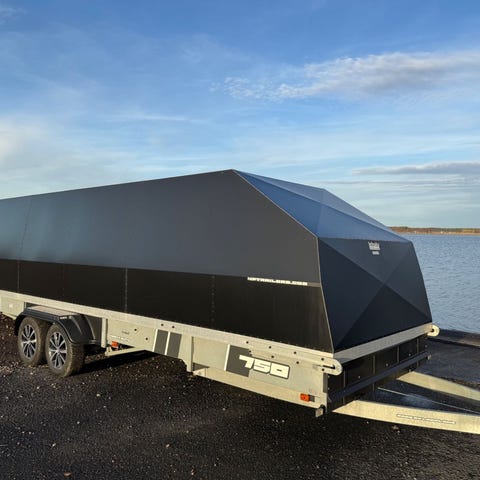 Fint kåpsläp med lastyta 5×1,8meter, ledbelysning i kåpan och baktill, backljus, aluhjul till sommar och vinterdäck, tipp, nybesiktigad till 27-12-31, bra skotersläp. Ev byte 5,5 meter och nyare.
