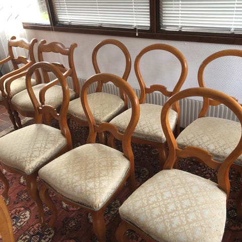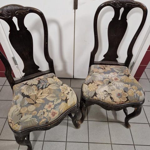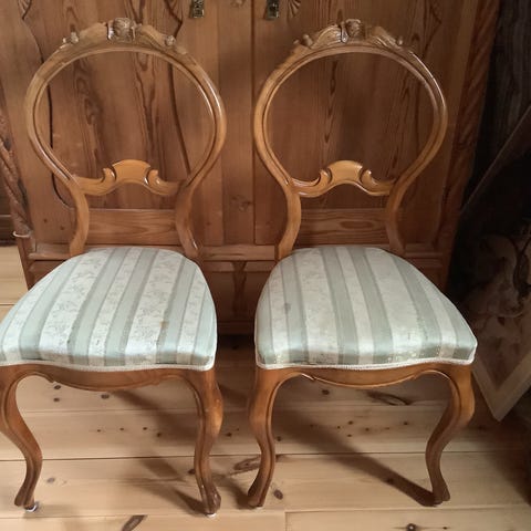 Fyra stycken stolar i Rokoko-stil. Omklädda i mönstrar vitt tyg. Pris avser alla stolar tillsammans.