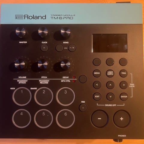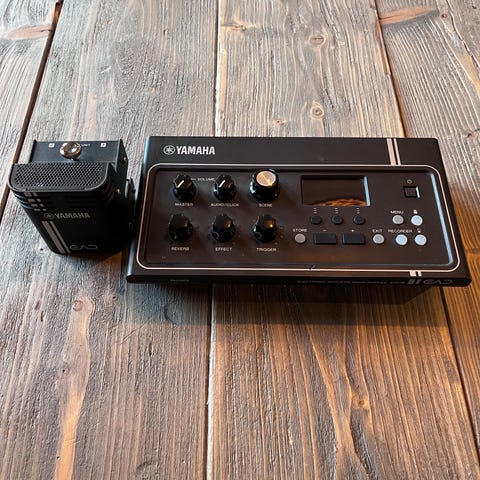 Yamaha EAD10 är en elektronisk trumsetmodul med inbyggda funktioner för inspelning, ljudredigering och trumtriggering. Den har en display för användargränssnitt, volym- och effektkontroller samt anslutningar för kablar och trumtrigger. Modulen är avsedd för användning med akustiska trummor för att förstärka och bearbeta ljudet.