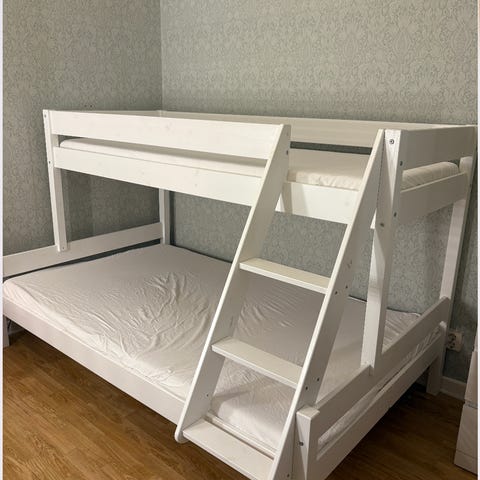 IKEA TUFFING våningssäng i grå färg. Sängen är utformad för att rymma två personer, en över och en under, och är utrustad med en stege för åtkomst till övervåningen. Sängen har en robust konstruktion i metall och är lämplig för barn eller ungdomar. Väljer du att köpa till madrassen ökar priset till 750.