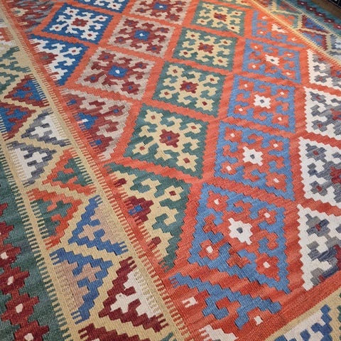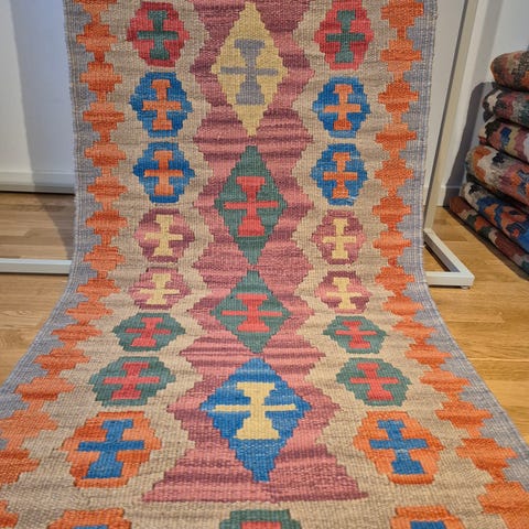 &Tradition Kelim matta med flerfärgat mönster. Mattan har traditionell kelimdesign med geometriska former i olika färger.