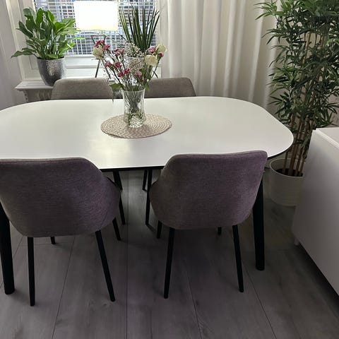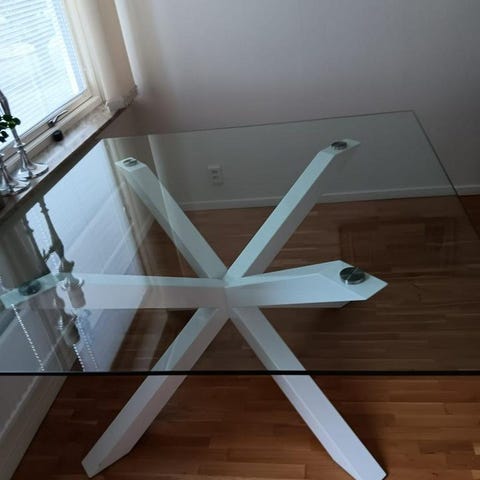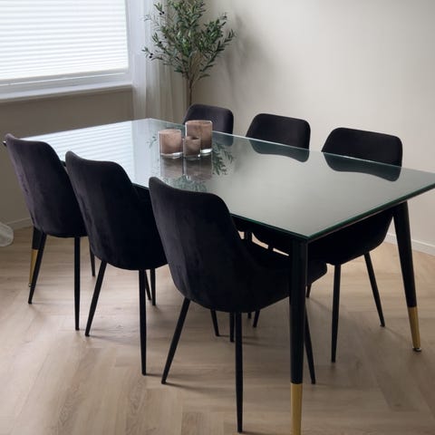 Fint glasbord från Mio med tillhörande 6 stolar Leo, nypris 15.000kr.