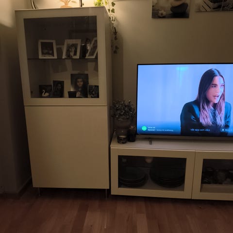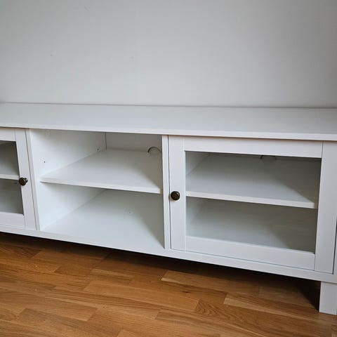 Vit TV-bänk där mitt delen är en vitrinskåp liknande med glas hyllor samt glasdörrar. Skåpen på varsin sida har en fin struktur på dörrarna samt trähyllor i.