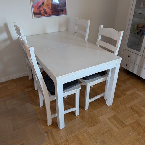 Matgrupp till kontoret: 6 vita stolar, två matbord, ett mindre bord
