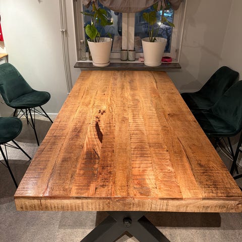 Säljer ett rejält och elegant matbord i mörkt trä med vacker, levande trästruktur. Ett riktigt statement-bord som passar perfekt för stora middagar, högtider eller som konferensbord.