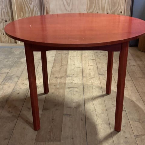 Runt matbord och sex stolar i teak. Extra iläggsskivor möjliggör 10 samtidiga ätande personer.