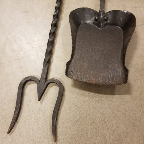 Brastillbehör Sekelskifte eldgaffelset i mässing.