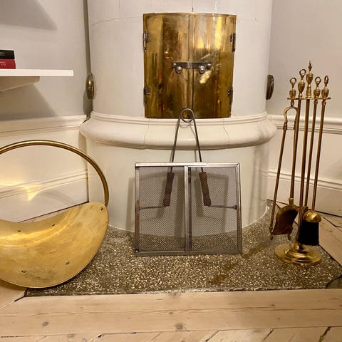 Klassiskt eldgaffelset i obehandlad mässing med fyra brasverktyg: borste, spade, tång och pekare.