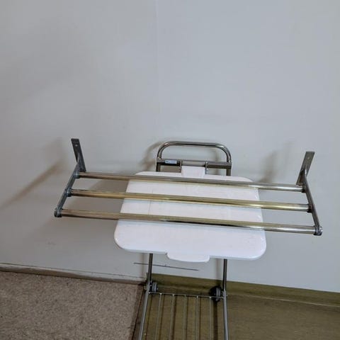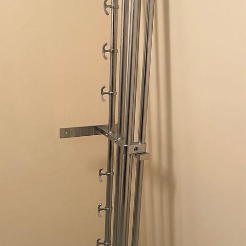 Vit hatthylla, "Rio", för Ab Byggbeslag, lackerad metall, krom, plast.