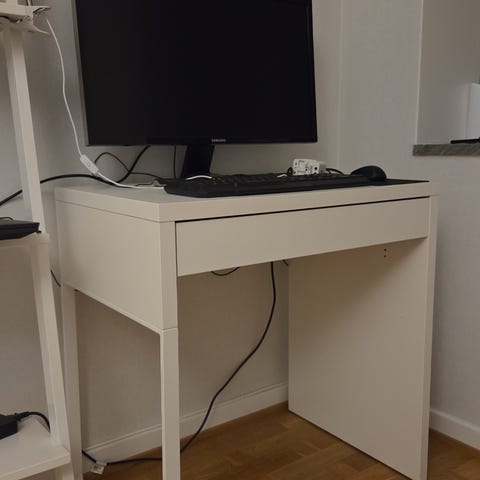 Nätt litet skrivbord med en låda i ekfaner och stålram.