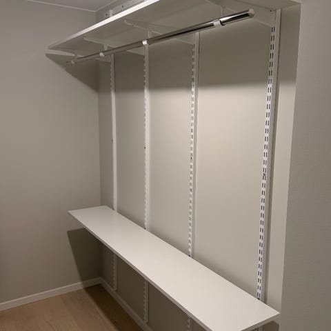 Säljer ett komplett Elfa garderobssystem i mycket gott skick. Perfekt för dig som vill bygga eller komplettera en garderob, walk-in closet eller förråd.