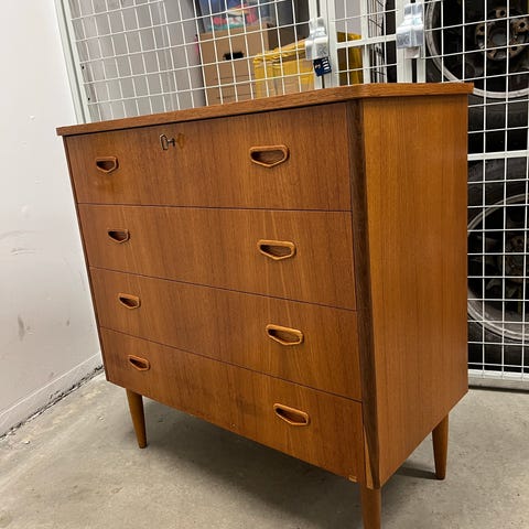 Byrå/sideboard i teakfanér, klädd i galon med nitar, från mitten av 1900-talet. IKEA.