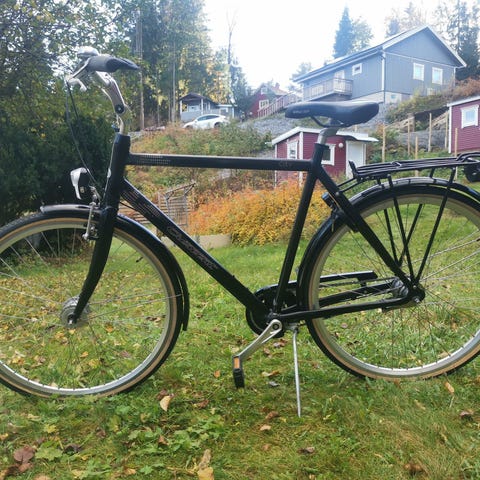 Kedjeskydd, stöd, stänkskydd, korg, belysning, ringklocka, fotbroms samt handbroms