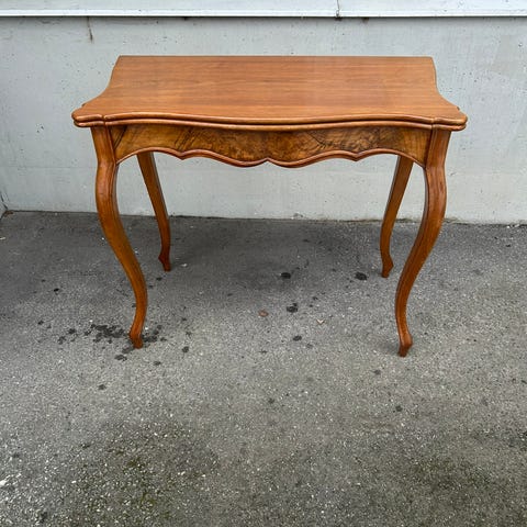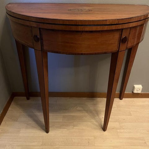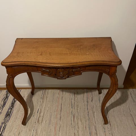 Antikt bord i ek med inbyggt backgammonspel nyrenässans 1800 talets senare del. Bordet har en rektangulär form och är tillverkat i ek med en naturlig träfinish. Under bordsskivan finns ett backgammonspel med färgerna rött, gult och svart. Bordet har fyra snidade ben och en funktion som gör att bordsskivan kan öppnas för att visa spelet. Passar för både spel och som ett dekorativt möbel.