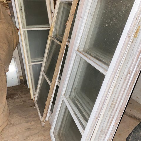 Vackert äldre fönster med blyinfattat, lätt färgat glas i klassiskt mönster. Ger fint ljusinsläpp och massor av karaktär – perfekt som inredningsdetalj, väggdekoration, i växthus eller vid renovering i äldre stil.