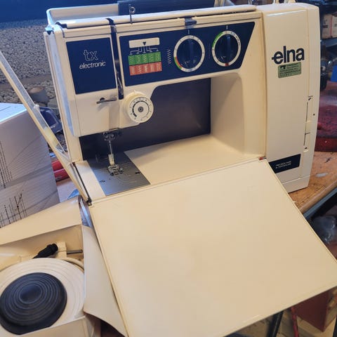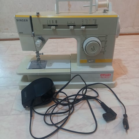 Singer Tradition symaskin i vit färg. Maskinen är avsedd för allmän sömnad och har en kompakt design. Den drivs med el och har en fotpedal för kontroll av sömnadshastigheten.