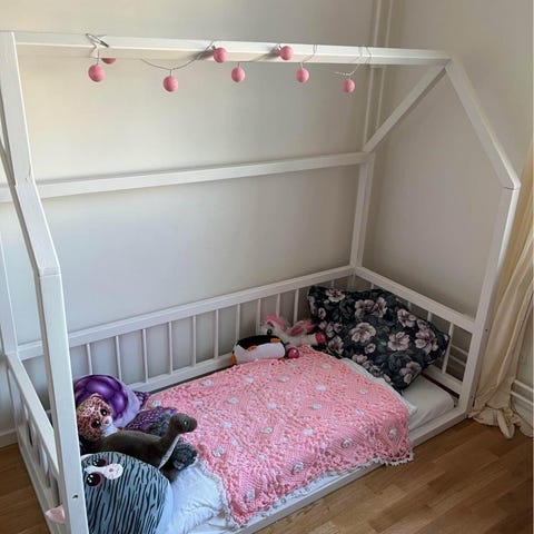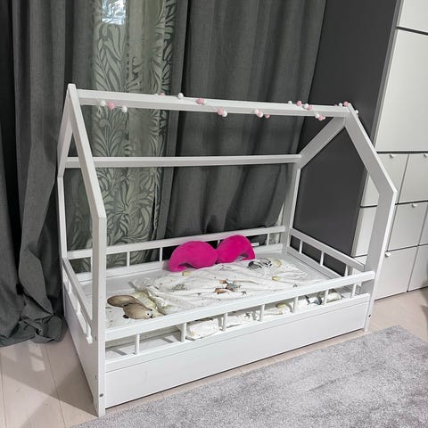Det finns en liten skada, se bild, men den påverkar inte funktionen. Sängramen är i använt skick med små märken här och där men har mycket mer att ge i barnrummet. Perfekt bredd för att natta eller sova bredvid sitt barn.